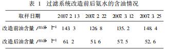 采用微孔陶瓷過(guò)濾器進(jìn)行氨水除油,從2007年2月運(yùn)行半年以來(lái),取得了很好的效果,為后道工序創(chuàng)造了良好的條件,穩(wěn)定了生化污水的進(jìn)水水質(zhì),提高了污水處理效率。氨水表面看不到有明顯的浮油。蒸氨塔底部排出的焦油量大幅度減少。蒸氨塔塔壓降低,排油管道堵塞次數(shù)明顯減少。經(jīng)化驗(yàn)得知,氨水含油量大幅度降低,從以前的140mg/l降低到目前的60mg/l,表1為氨水過(guò)濾系統(tǒng)改造前后氨水含油量的對(duì)比情況。